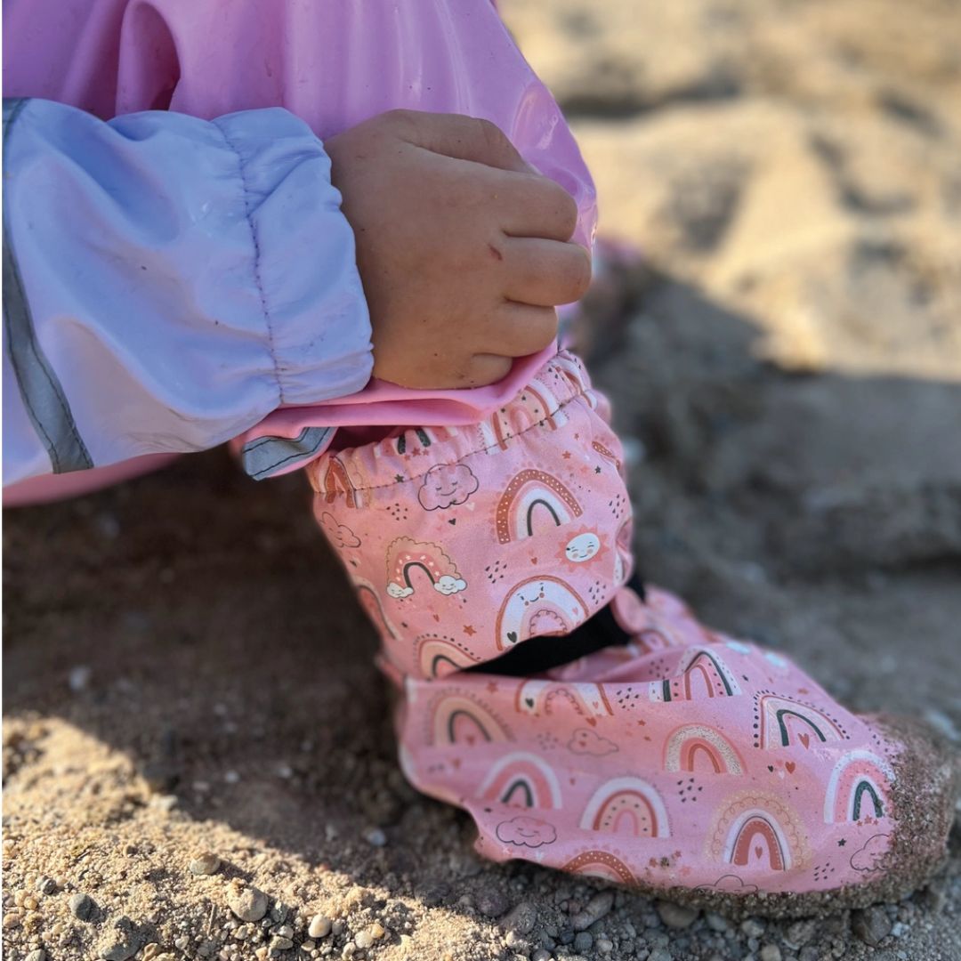 Myke og vanntette regnsokker som holder små føtter tørre og varme i vått vær. Perfekte til bruk utenpå sokker eller tøfler for barn som krabber eller sitter i vogn.