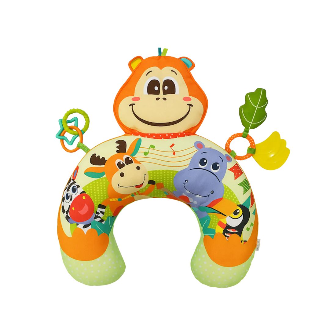 Denne myke puten er formet som en glad ape og dekorert med søte dyremotiver som fanger barnets oppmerksomhet.