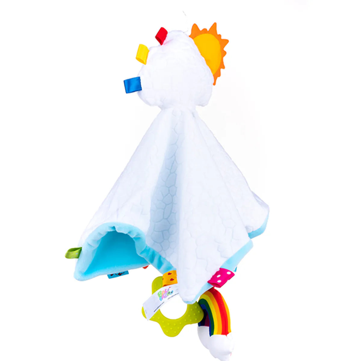 Her finner du fargerike stofflapper i ulike teksturer som utvikler følesansen, en skyformet rangle som lager myke lyder, en blomsterformet biteleke som lindrer såre gommer, samt en sol som knitrer når barnet berører den.