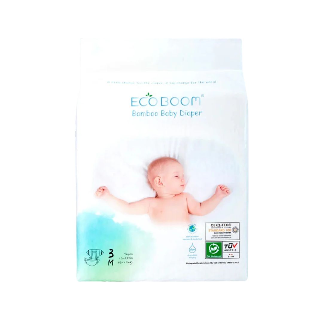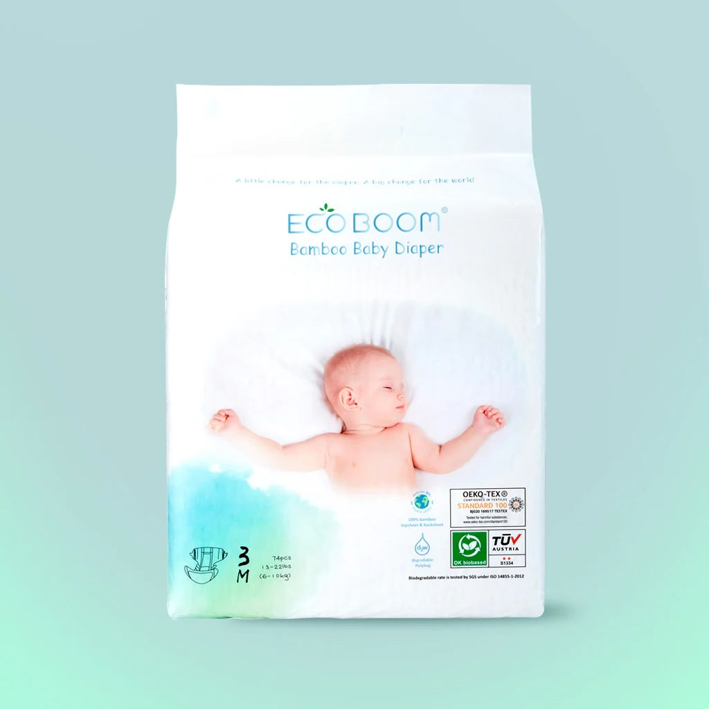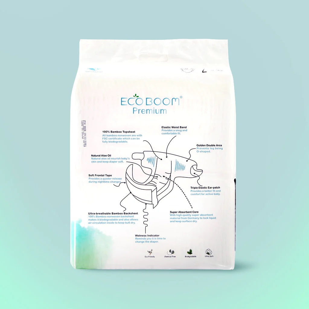 Produksjonen er helt fri for klor og unødvendige kjemikalier, og bleiene er biologisk nedbrytbare – under riktige forhold brytes omtrent 70 % ned på rundt 147 dager. Emballasjen er laget av miljøvennlig D2W-materiale som brytes ned innen 18 måneder, noe som gjør Eco Boom til et mer bærekraftig valg for både barnet ditt og miljøet.