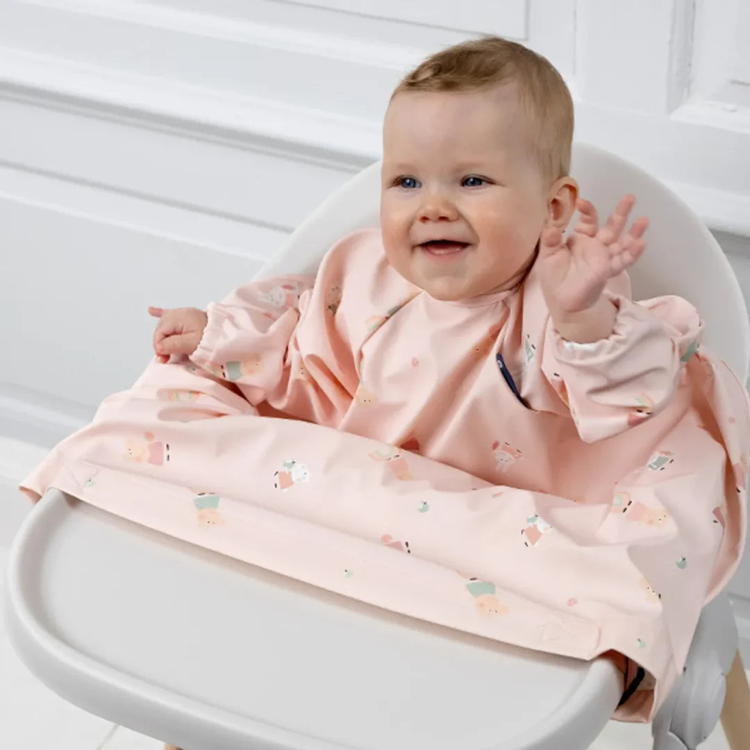 Denne geniale, langermede smekken fra Bibado gjør måltidene enklere og rengjøringen raskere! Smekken festes sikkert til barnestolen, og er designet for å passe de fleste barnestoler – både de med store, brede brett og de uten. Den kan også brukes med mange barnevogner eller direkte på bordet.