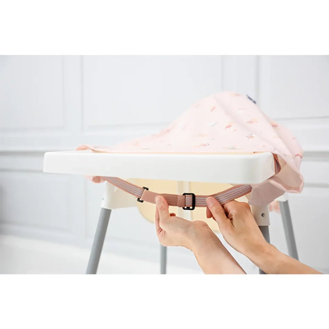 Draper fronten av smekken over barnestolbrettet og fest den under med justerbare borrelåsstropper.