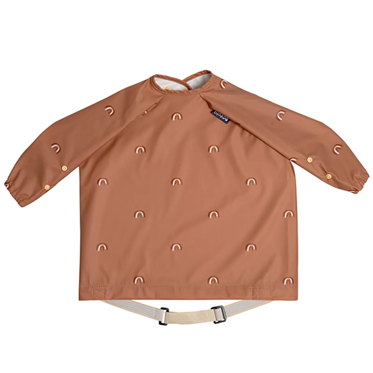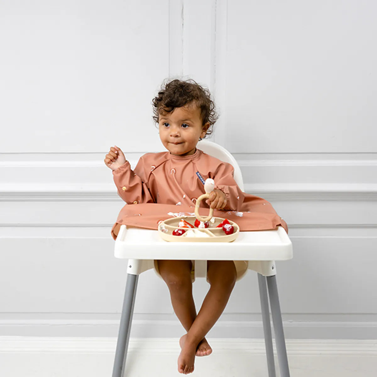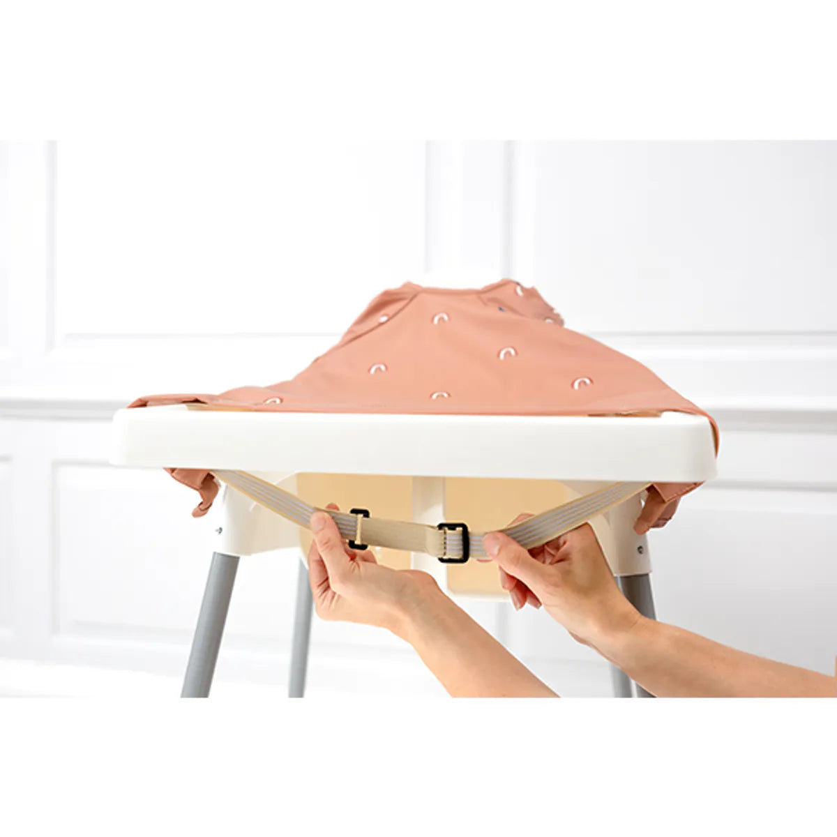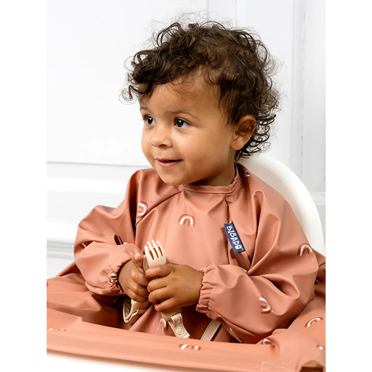 Bibado langermet smekke festes sikkert til de fleste barnestoler, og beskytter klær og stol mot søl. Den kan også brukes med mange barnevogner eller direkte på bordet.