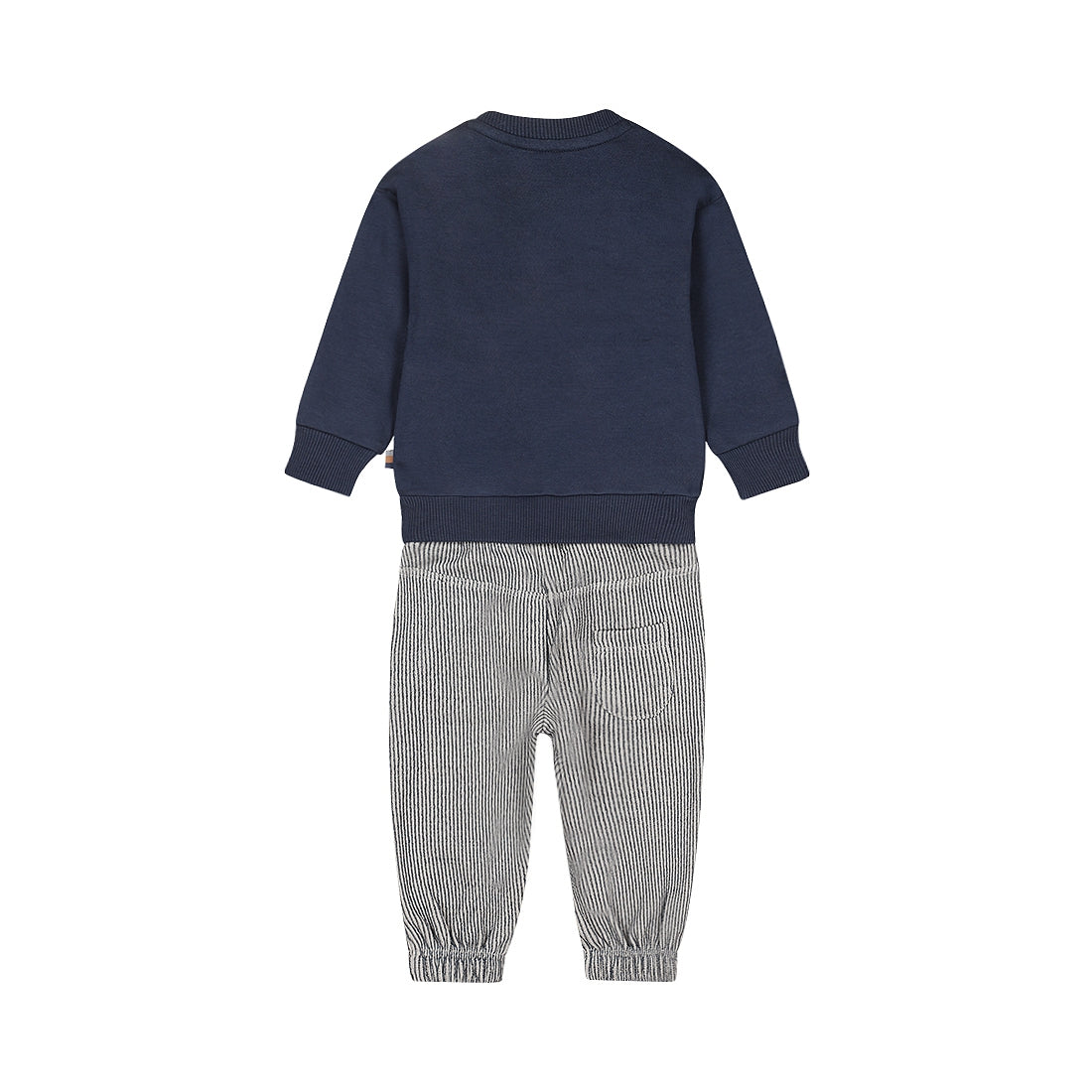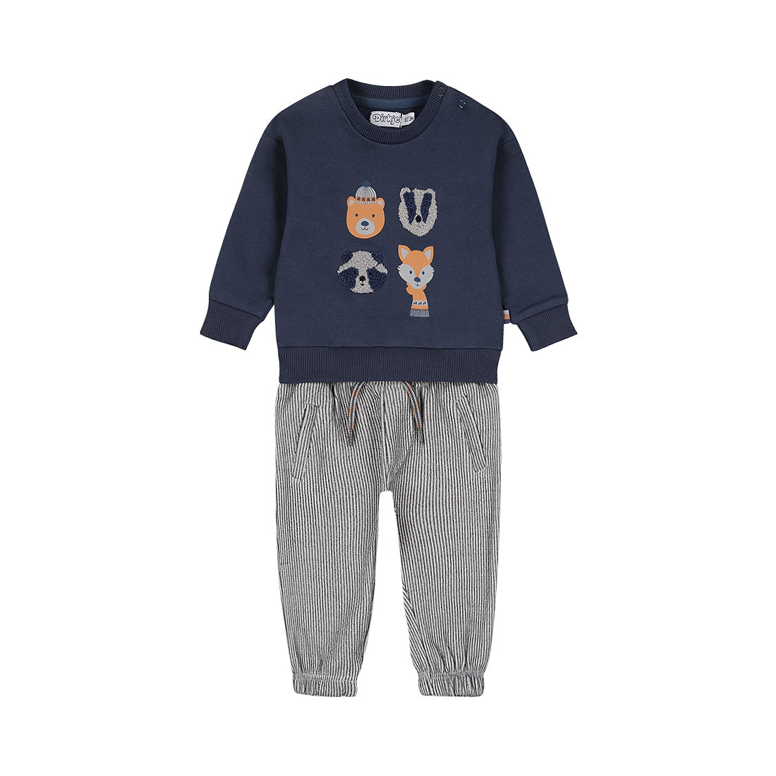Dette myke babysettet fra Dirkje er perfekt til kalde dager. Den mørkeblå genseren har søte små skogsdyr i teddy på forsiden og praktiske trykknapper på skulderen som gjør den enkel å ta av og på. De matchende stripete buksene med elastisk midje og mansjetter ved bena gir en behagelig passform og ekstra komfort.