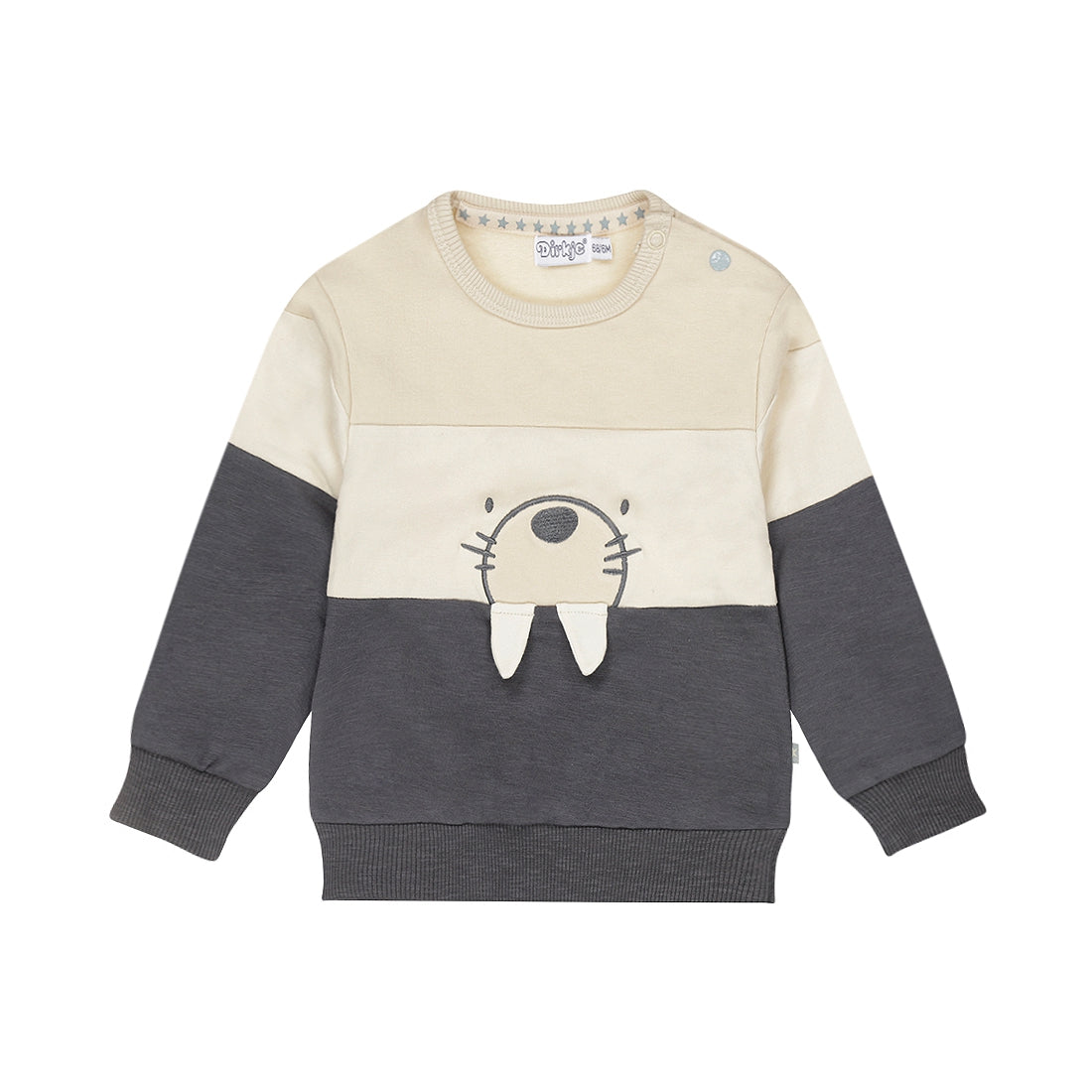Den friske fargekombinasjonen av lysebrun, offwhite og mørkeblå gir et kult uttrykk, mens det søte hvalrossmotivet på brystet tilfører et sjarmerende preg. Laget av myk bomull med stretch som gir barnet god komfort og bevegelsesfrihet hele dagen.