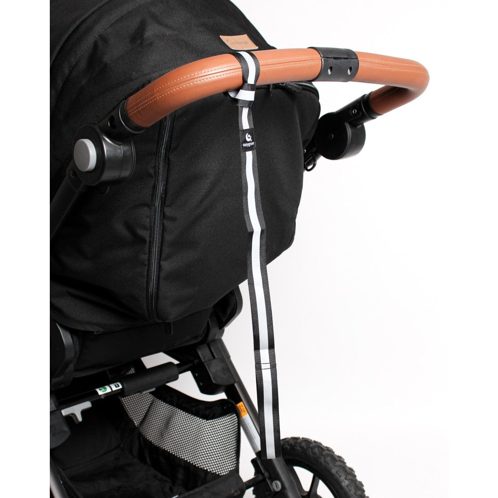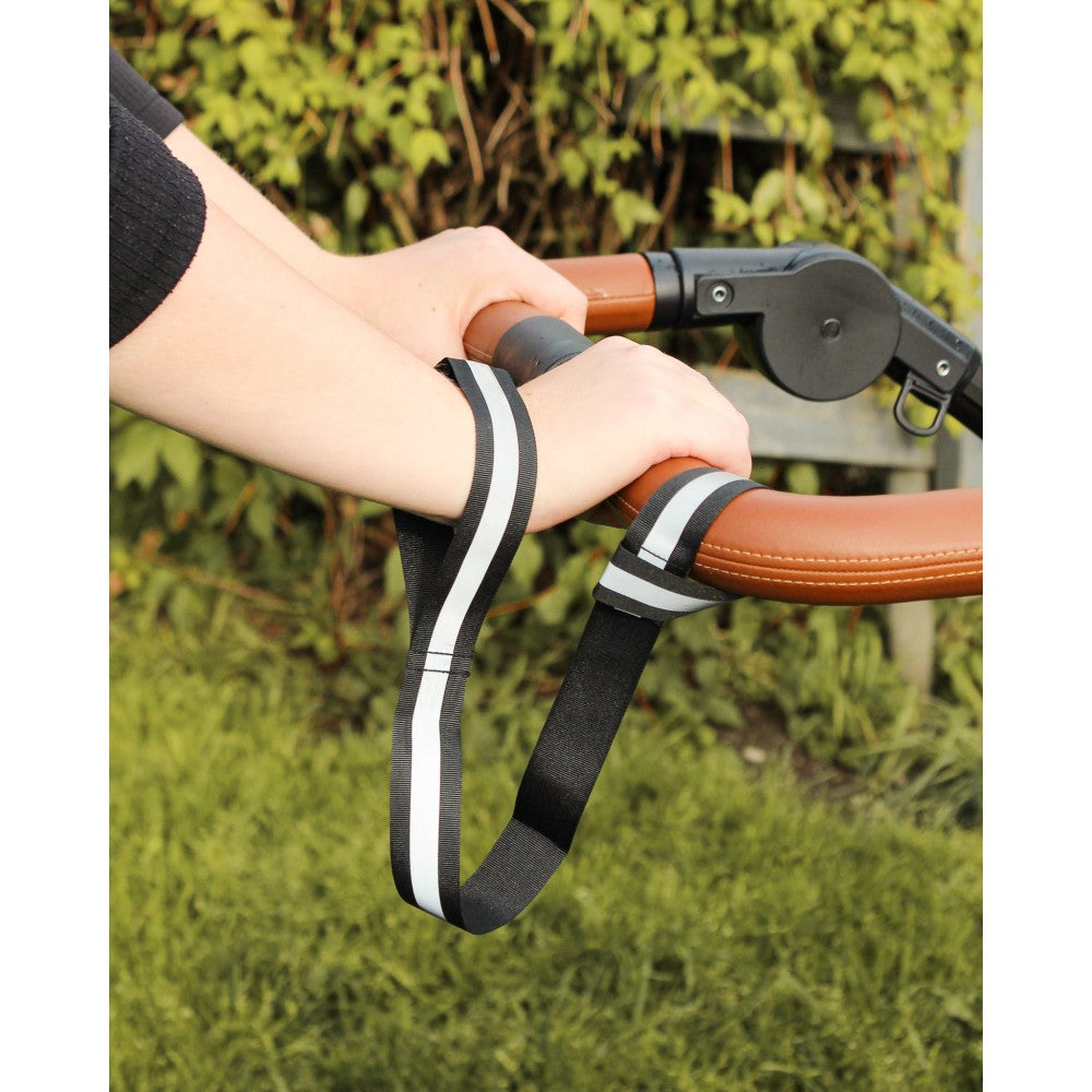 Båndet festes mellom håndleddet ditt og barnevognen, slik at vognen ikke kan trille avgårde ved uhell.
