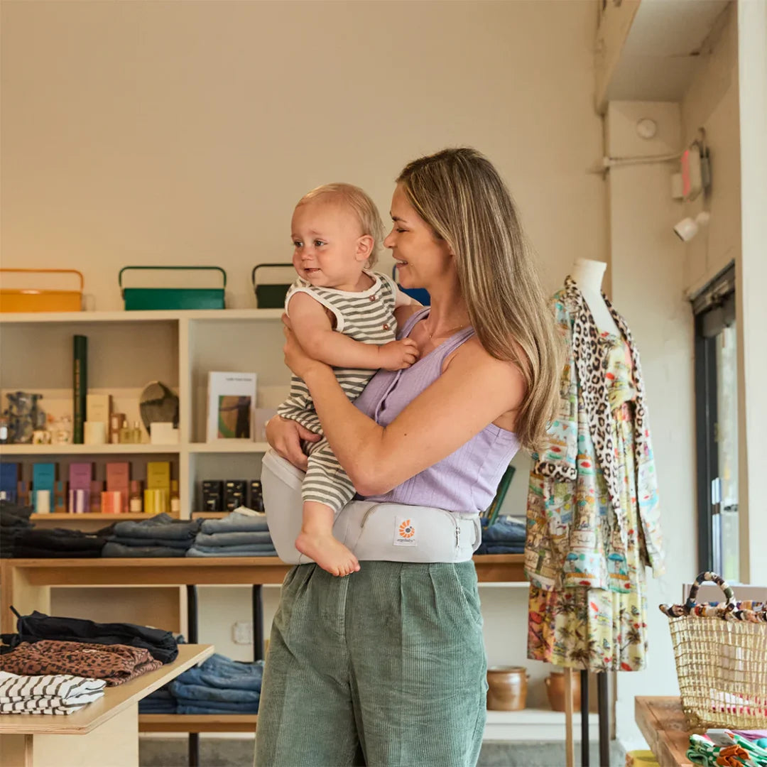 Ergobaby Lift Hoftebærer er utviklet for foreldre med barn som ofte vil opp og ned. Den gir god støtte til barnets vekt og reduserer belastning på rygg, hofter og armer, uten å være en full bæresele.