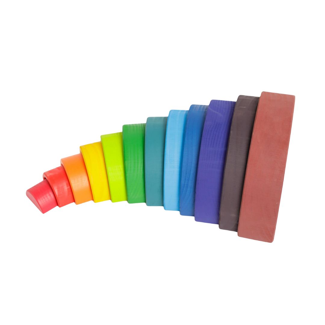 Denne store stable-regnbuen i sterke, klare regnbuefarger inspirerer til kreativ og fantasifull lek. De glatte buene kan stables, balanseres og settes sammen i utallige kombinasjoner, noe som hjelper barnet å utvikle motorikk, koordinasjon og romforståelse.
