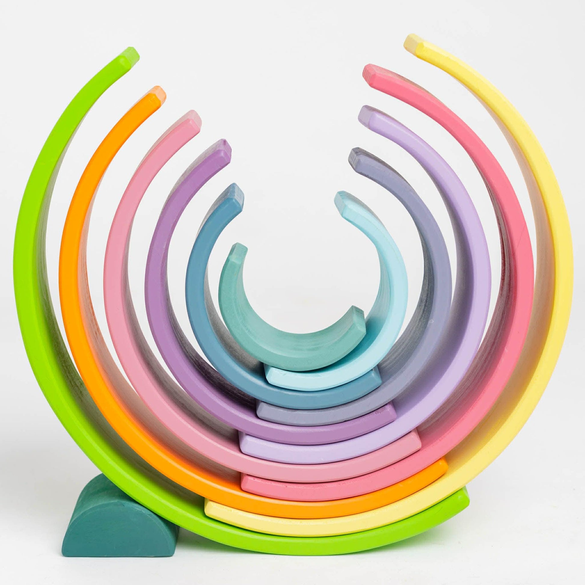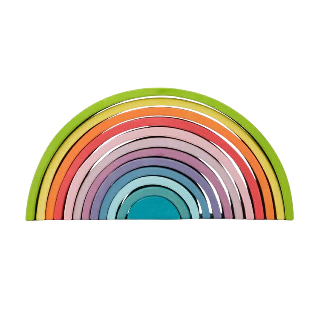 Denne store stable-regnbuen i sterke, klare regnbuefarger inspirerer til kreativ og fantasifull lek. De glatte buene kan stables, balanseres og settes sammen i utallige kombinasjoner, noe som hjelper barnet å utvikle motorikk, koordinasjon og romforståelse.