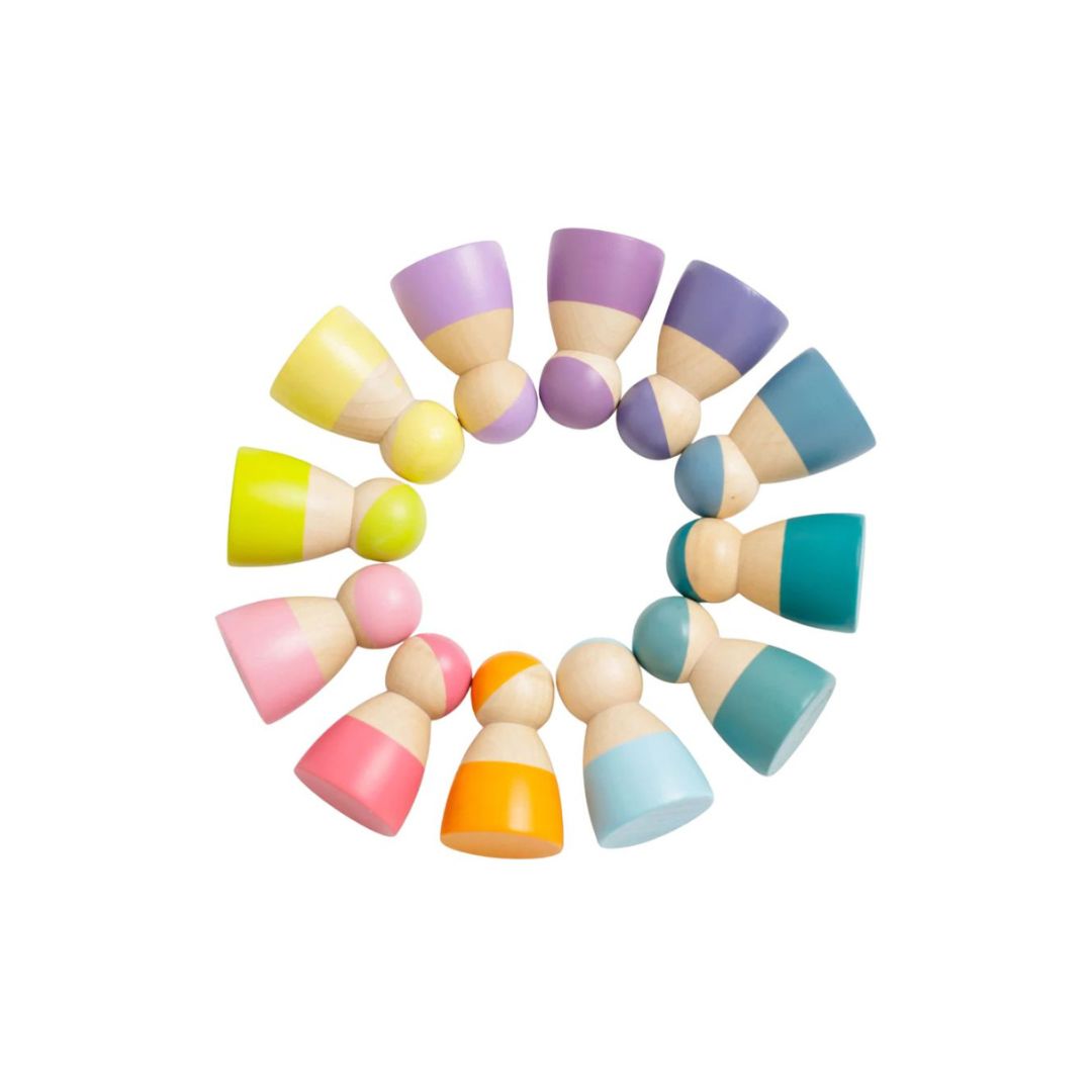 Disse sjarmerende trefigurene i myke pastellfarger skaper en rolig og inspirerende lekeopplevelse. De kan brukes alene eller sammen med stable-regnbuer og andre byggesett, og gir barnet frihet til å utforske balanse, farger og kreativ lek.