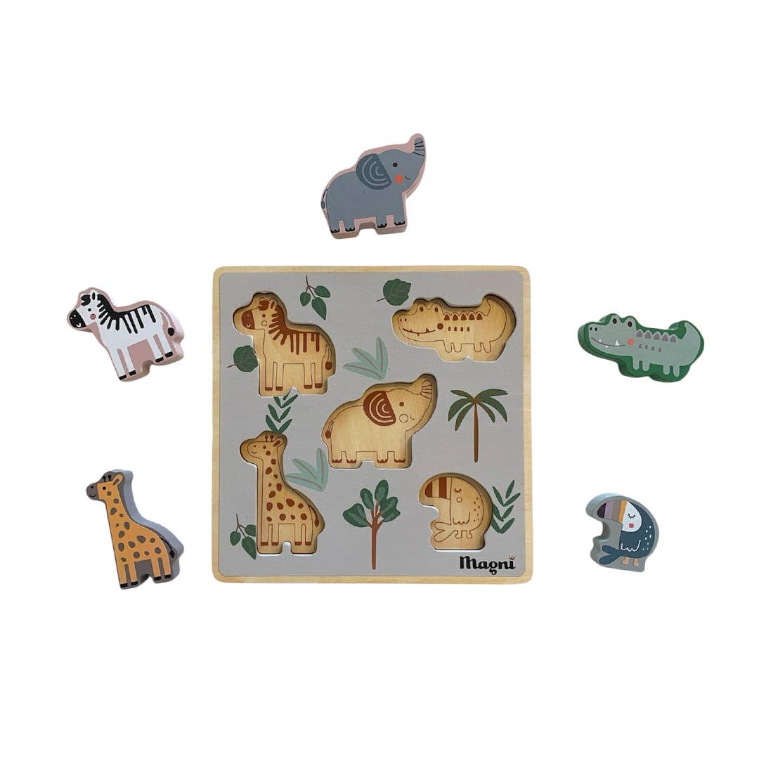 Magni Montessori Dyrepuslespill er utviklet spesielt for små hender, med store og solide brikker som er enkle å gripe og plassere. Puslespillet er laget av bærekraftige FSC 100 % sertifiserte materialer og har motiver fra Magnis populære dyreserie.