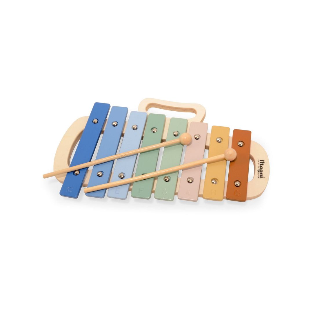 Morsomme og enkle nybegynnerinstrumenter for barn, ettersom lopper i blodet og hopp og lek til musikk er en del av barndommen! Kreativitet er ikke bare maling og leire, men også rytme og mulighet til å utforske egen musikalitet. Xylofon av tre og metall – en enkel og pedagogisk måte å lære seg toner på. 33 cm bred.