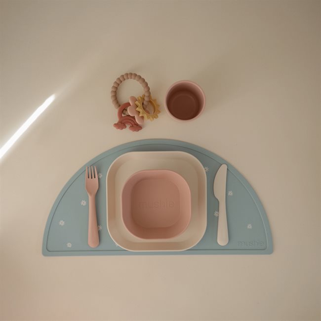 Mushie plastbestikk er designet i rolige farger og med et rent, skandinavisk uttrykk. Settet er nøye utformet i riktig størrelse for små hender, og hjelper barnet med å utvikle selvstendige spiseferdigheter og økt mestring ved måltidene.