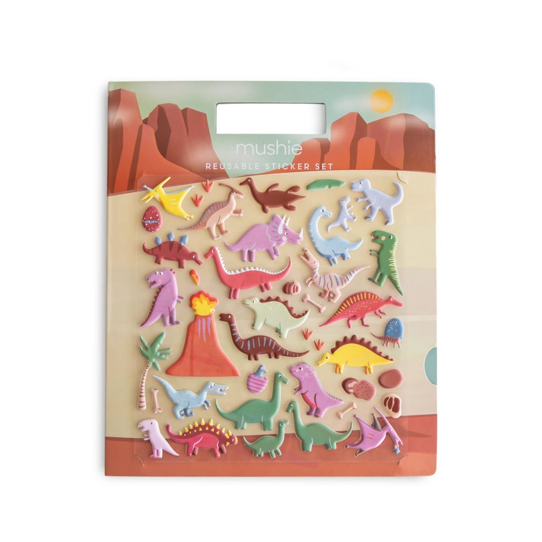 Mushie gjenbrukbart klistremerkesett er et kreativt og lærerikt lekesett som inviterer barn til å utforske, leke og lage egne historier. Settet passer for barn fra 3 år og finnes i flere spennende temaer som dinosaurer, verdensrommet, bondegård og kjøretøy.