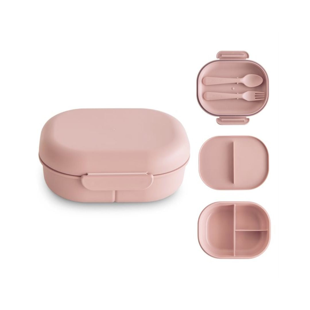 Matboksen leveres med matchende skje og gaffel som festes sikkert på innsiden og holdes rene takket være den avtakbare skilleveggen. Perfekt for barnehage, utflukter og måltider på farten.