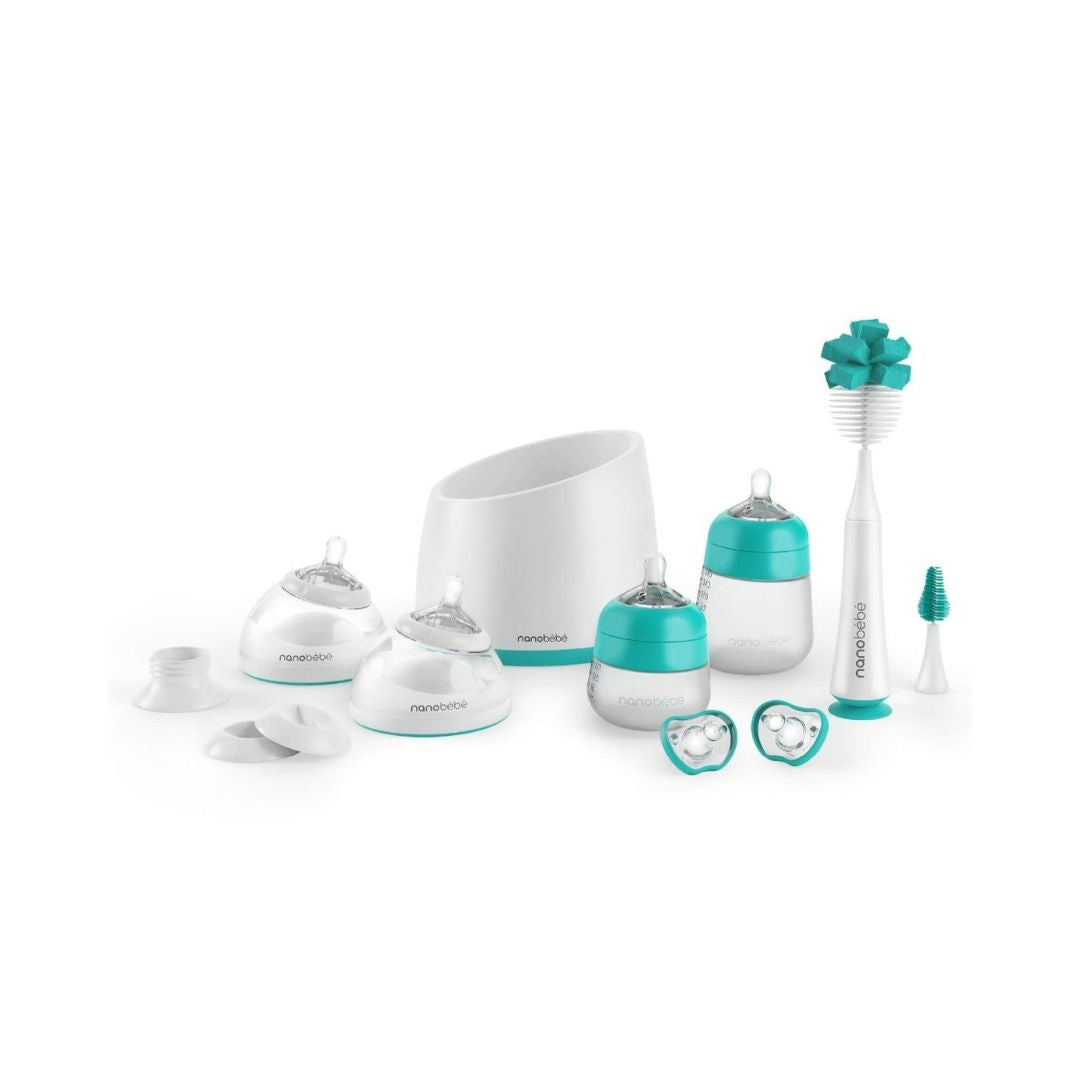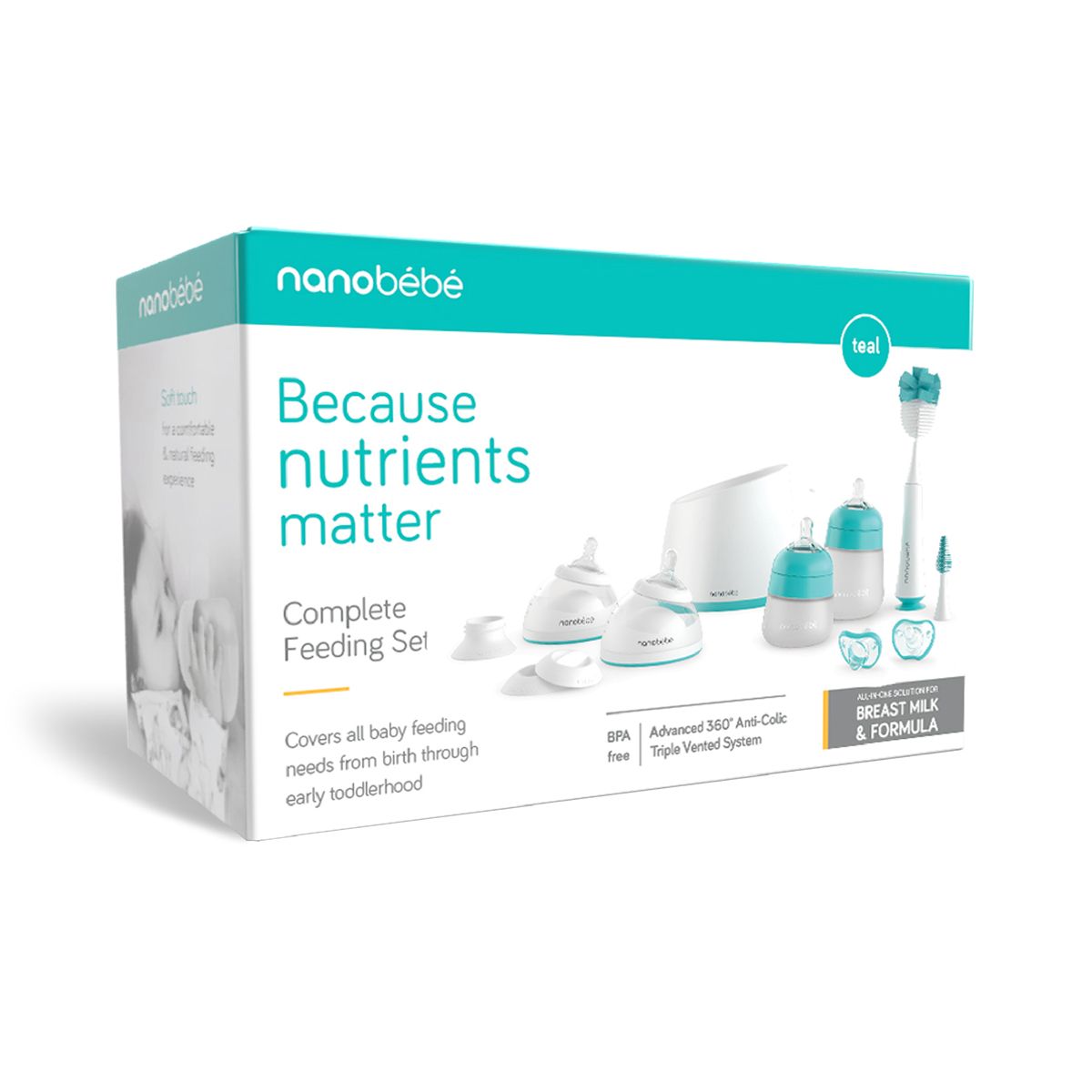 Nanobébé Komplett Sett samler begge de prisvinnende flaskene – den unike tåteflasken for morsmelk og den myke silikonflasken – i én praktisk gaveeske.