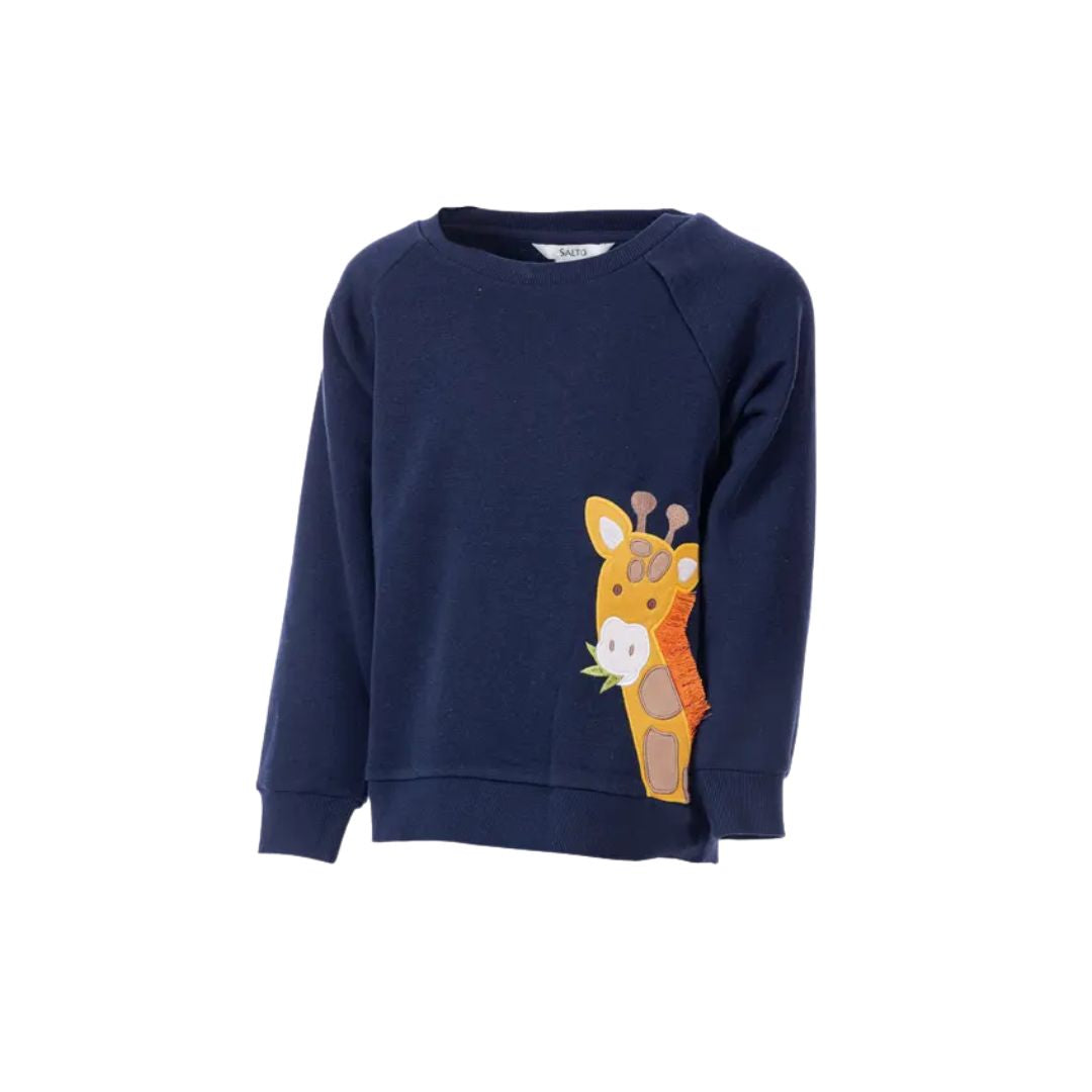 Myk og komfortabel genser fra Salto med søtt sjiraffmotiv på forsiden.